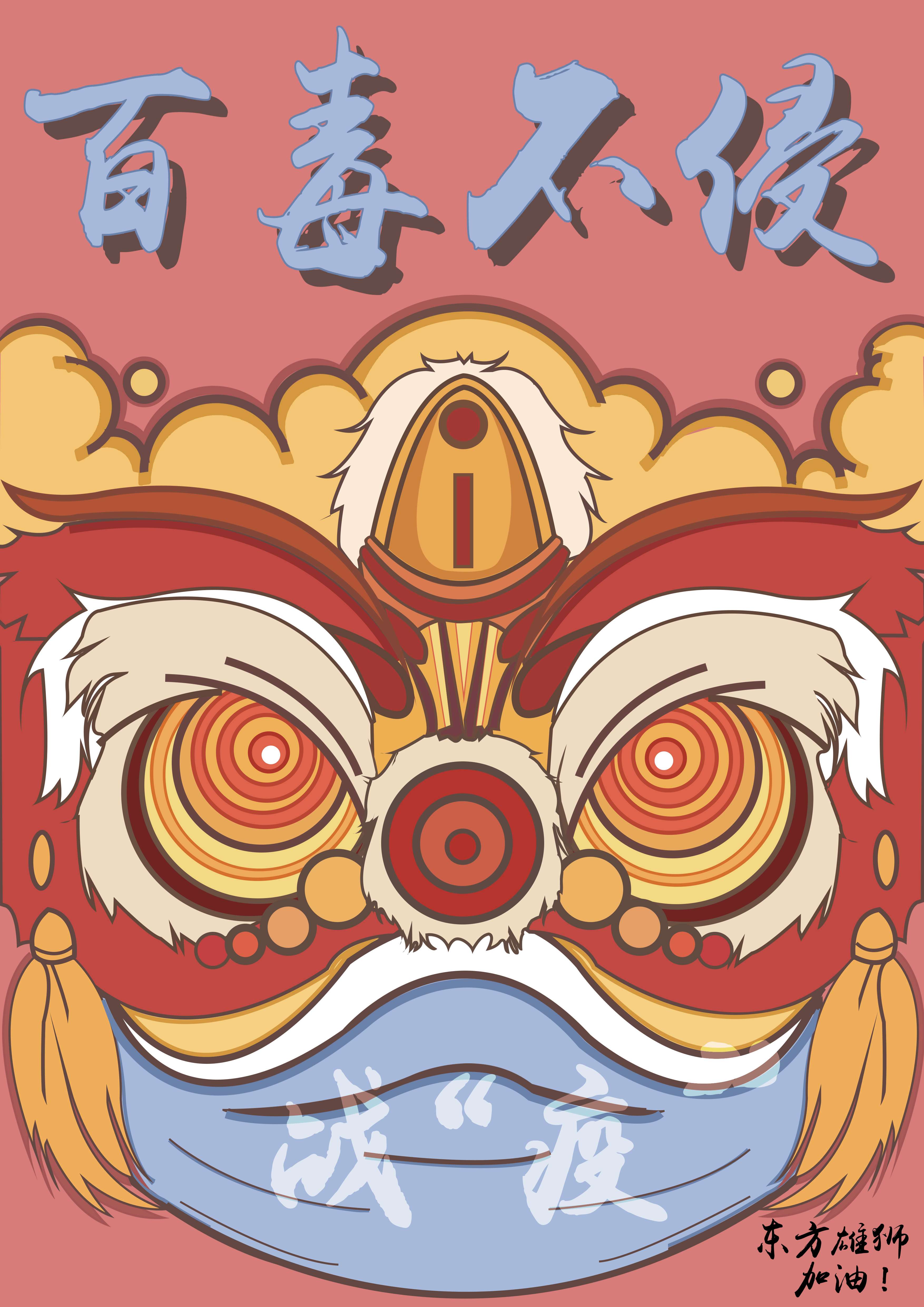 作品说明:中国曾一度被西方国家称为“沉睡的东方雄狮”,但随着科技的进步、经济实力的提升,中国让全世界人看到了我们的崛起,在今我们虽遭受着病毒性肺炎的困境,但我们坚信我们伟大的祖国最终会克服困难,众志成城,让世界再次听见中国的嘶吼声。海报运用古纹饰狮子为创作原型,色彩运用现大火的国潮色彩,将中国的传统和现代的流行紧密结合,整体表达美好的祝愿,愿我们百毒不侵。