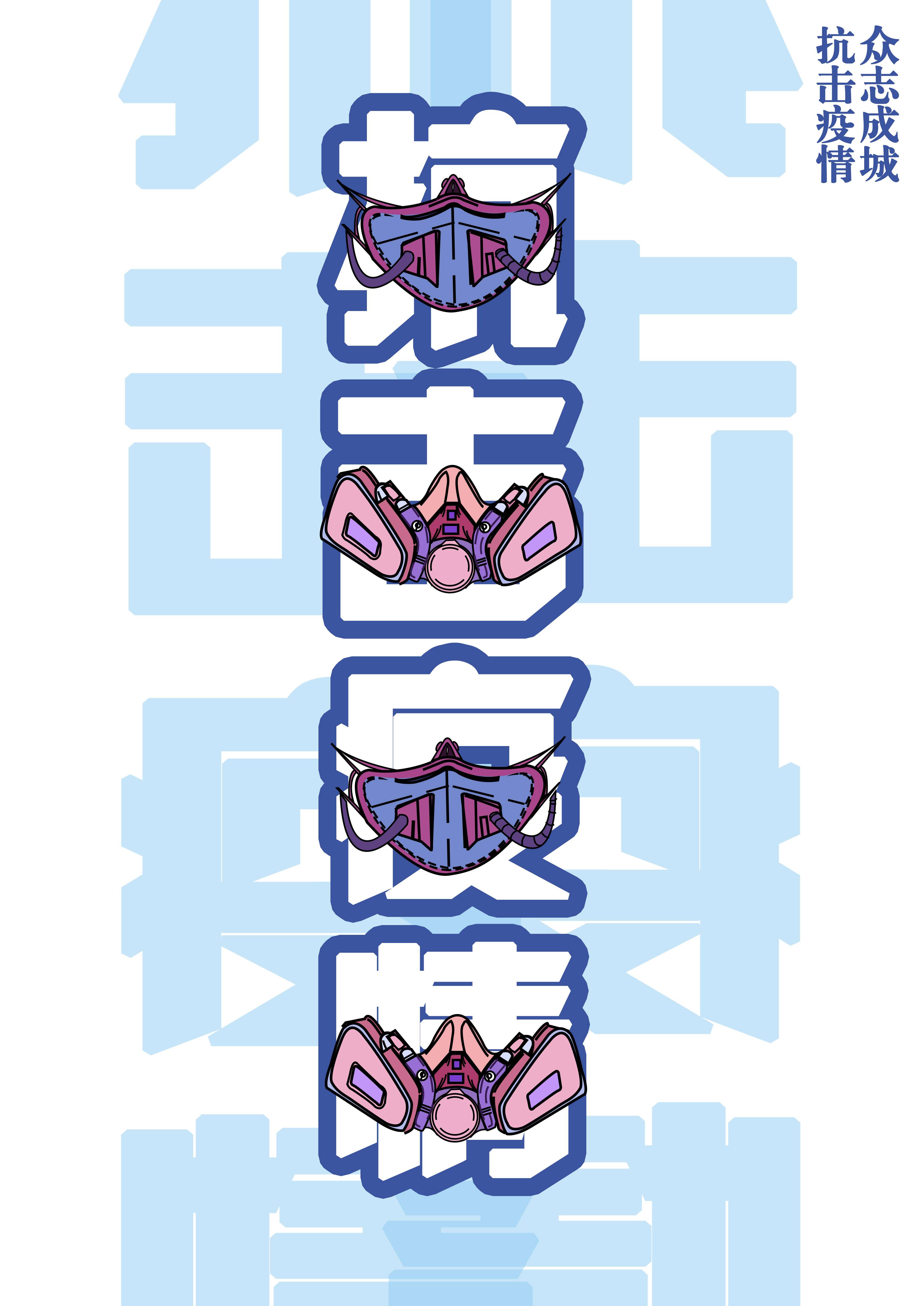 作品说明:海报主题用抗击疫情四个字作为主要设计元素,将文字拟人化,在文字中加入口罩的元素,在病毒肆意的现在,戴口罩不仅是保护自己,更是对他人的负责。清新的蓝色、白色以及粉色的配色,干净整洁的画面可以一扫人心惶惶的阴霾,我们一定会众志成城,击败病毒,赢得最终的胜利。