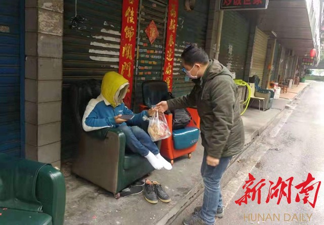 新湖南客户端2月3日讯(通讯员 周治中)“谢谢你们好心人,给我送来了鞋子和吃的。”在永祥小区F10栋鲍鱼铺们面前路过躲雨的年轻人小向感激的说道。今天上午阴雨绵绵,长沙市雨花区高桥街道永祥社区工作人员崔姐像往常一样在辖区进行疫情摸排工作,碰到一个小伙子在店铺前的沙发上休息,他穿了一双单薄的布鞋,没有穿袜子,鞋子还被雨淋湿了。在这个特殊时期,崔姐感觉情况不对,迅速将情况报告给社区党总支书记徐青峰。获知这一情况,徐书记带着工作人员第一时间赶到了现场。