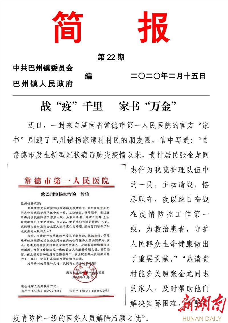 “这封短短的‘家书’,饱含着医院对张金龙家人的牵挂。”电话中,沈延明既为医院的家书叫好,又请记者转达他们对张金龙的关爱:“你放心,你在千里之外抗‘疫’,我们在后方守护你的家人。”