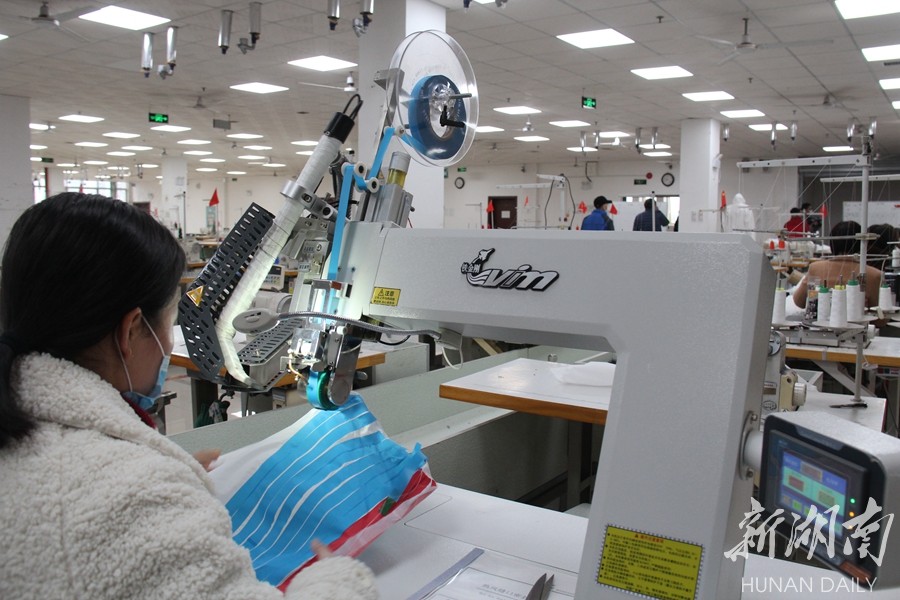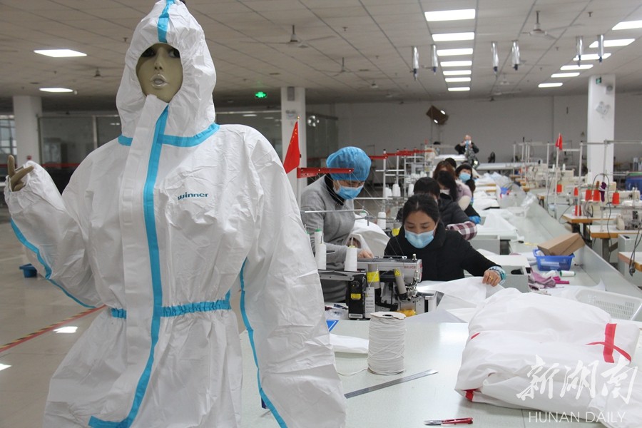 2月8日,衡山县工业园湖南华升金爽纺织服装有限公司生产车间,工人们正在生产防护服。在抗击新冠肺炎疫情的非常时期,该公司改造原有的服装生产线,投入到防护服、口罩等防疫物资生产中来,为打赢疫情防控阻击战助力。陈亮 摄