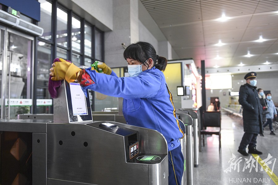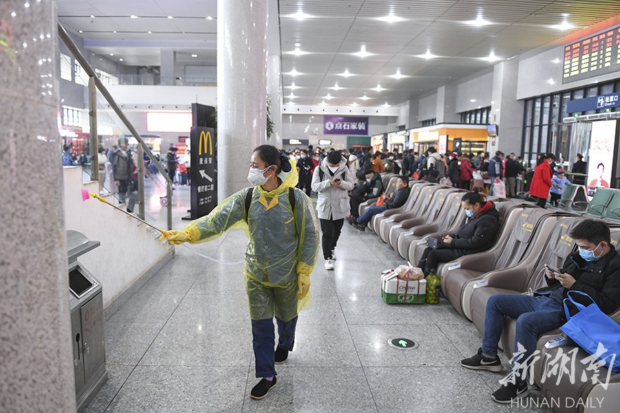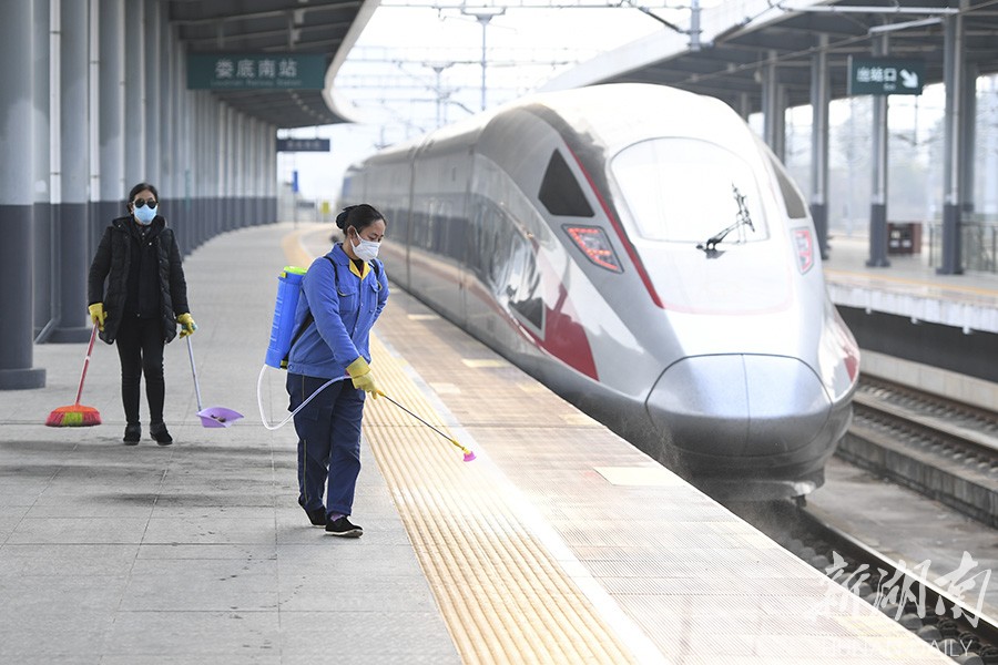 1月31日,高铁娄底南站,工作人员背着重达15公斤的消毒器在站台喷洒消毒液。自1月20日起,该站每日三次对候车大厅、进站口闸机、高铁站台等公共区域进行消毒,保障旅客及客运人员正常、安全出行。湖南日报记者 辜鹏博 通讯员 朱明维 摄影报道