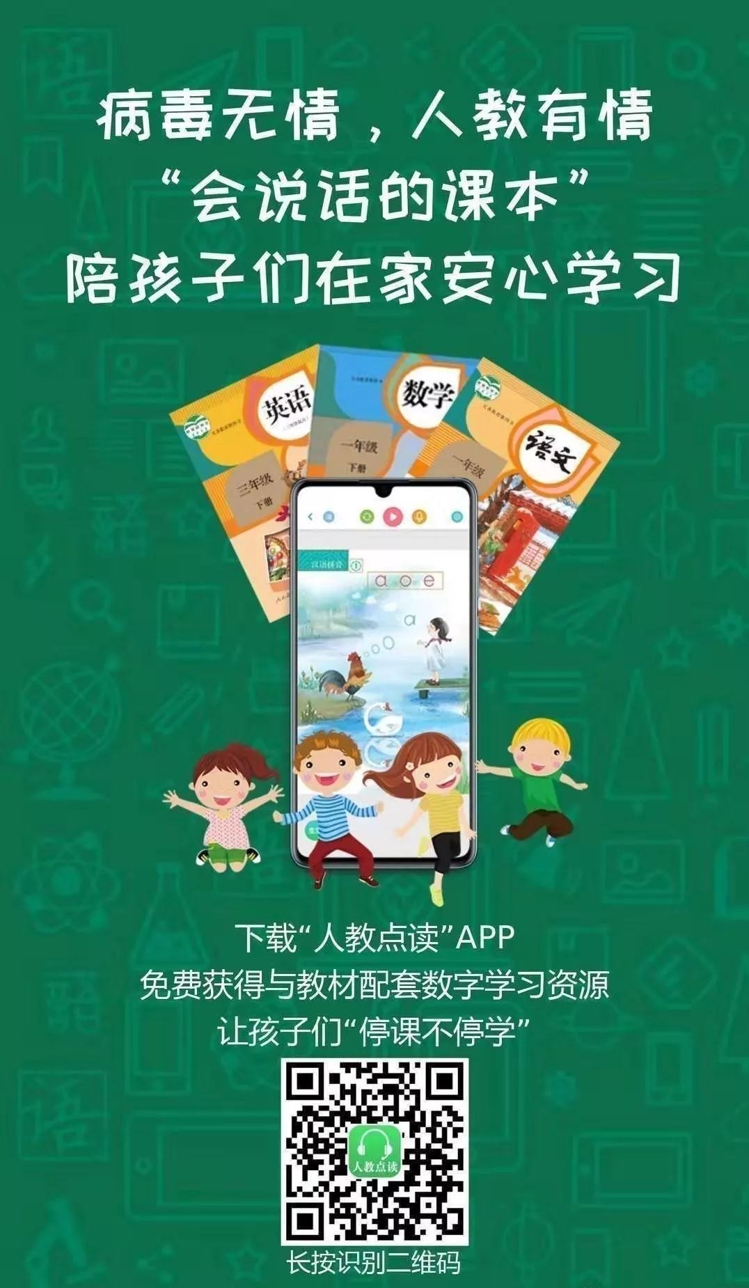 根据教育部文件精神,为了让孩子们“停课不停学”,方便学生在疫情防控、延期开学期间预习新课文和网上课堂教学,人民教育出版社“人教点读”APP,推出人教版电子教材,免费供学生和教师使用,请有需要的学校、教师和学生扫一扫下面二维码注册使用。