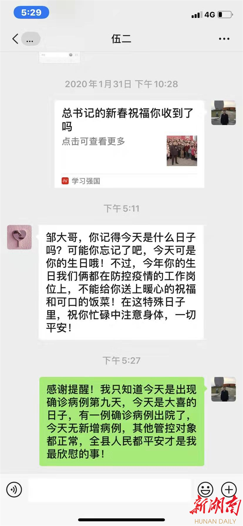 “邹大哥,你记得今天是什么日子吗?可能你忘记了吧,今天可是你的生日哦!不过今年你的生日我们两个都在防控疫情的工作岗位上,不能给你送上温暖的祝福和可口的饭菜!在这特殊的日子里,祝你忙碌中注意身体,一切平安!”短信是邹革的妻子伍梅英发来的。邹革着才想起来,今天是自己52的岁生日。