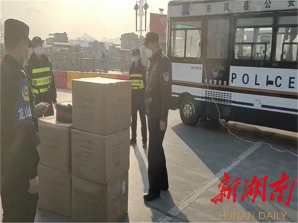 龙山“城市快警”将物资运送到湘鄂情大桥卡点