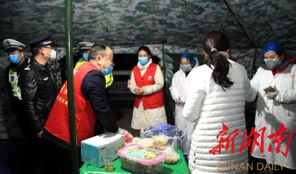 (慈善志愿者协会青年公社志愿者为通宵值守的白衣天使和交警送去水果、鸡蛋)