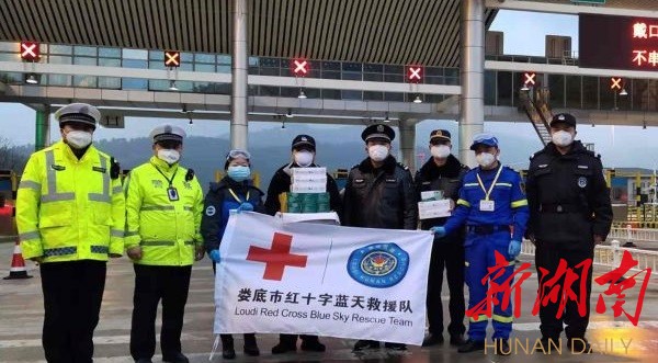 (2月2日,娄底市蓝天救援队为在高速公路收费站执勤的公安干警等一线人员送去口罩、防护镜)