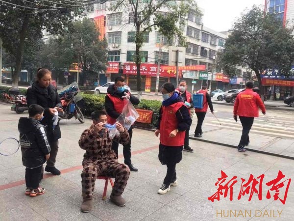 (2月1日,涟源市爱心志愿者为城区街上没有带口罩的市民免费发放口罩并告知正确佩戴方式)