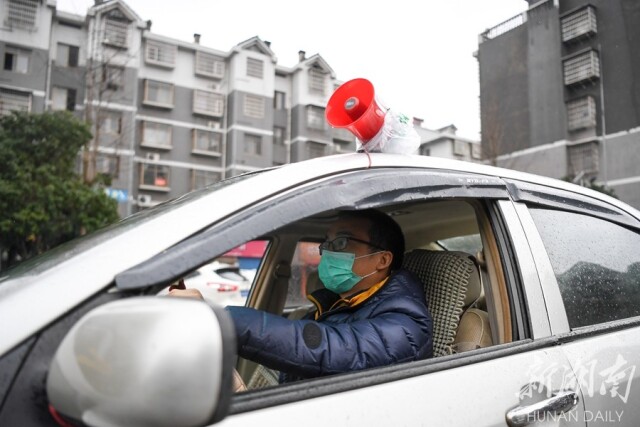 (社区志愿者在进行广播宣传。湖南日报·新湖南客户端 傅聪 摄)