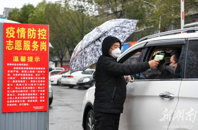(社区志愿者为进出居民测量体温。湖南日报·新湖南客户端 傅聪 摄)