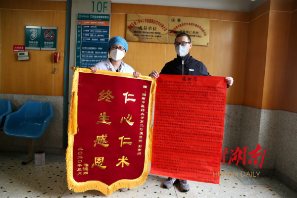 唐先生委托朋友给湖南省中医院呼吸内科主任彭素娟(左)送来锦旗和感谢信。通讯员摄