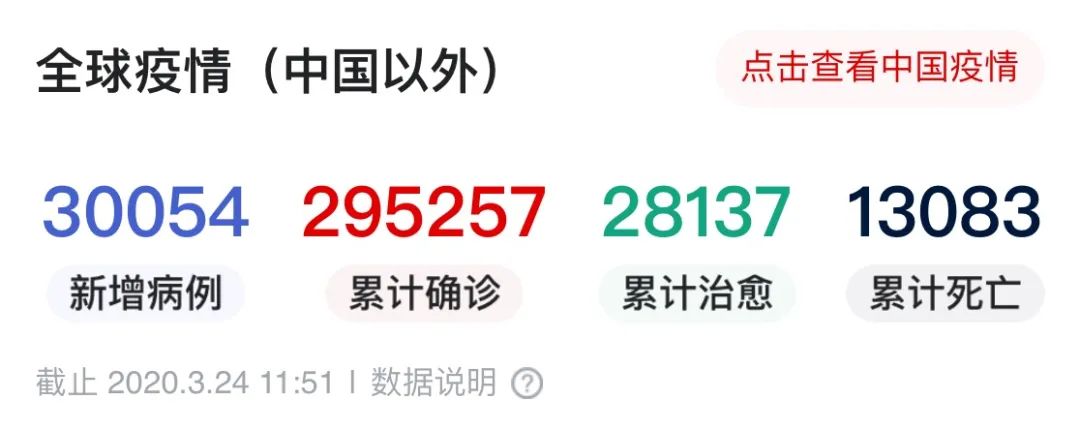 目前,疫情依然在全球范围内蔓延。据最新消息,截至3月24日上午11:51,中国以外全球确诊累计295257例。