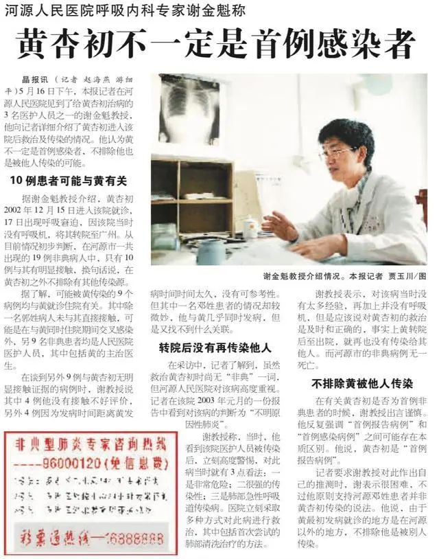 相关报道为黄杏初证明他不一定是SARS首例感染者