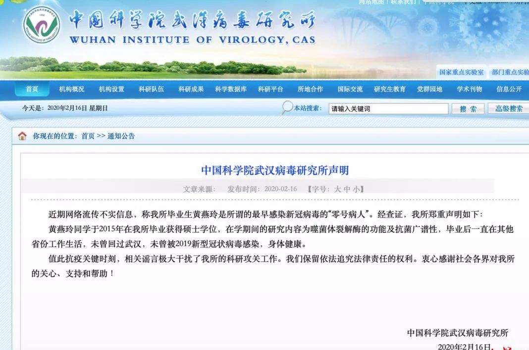 武汉病毒研究所就“新冠0号病人”传言发表声明