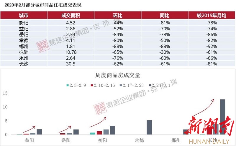 湖南日报·新湖南客户端3月18日讯(记者 张云龙)“湖南市场需求正逐步回温,成交呈现上行态势。随着生产生活的陆续恢复,预计二季度市场需求会有一定反弹。”今天下午,长沙克而瑞联合新湖南客户端等媒体,发布《2020年1-2月湖南房地产销售排行榜》《2020年2月长沙房地产销售排行榜》,直观呈现长沙及湖南房地产市场现状。