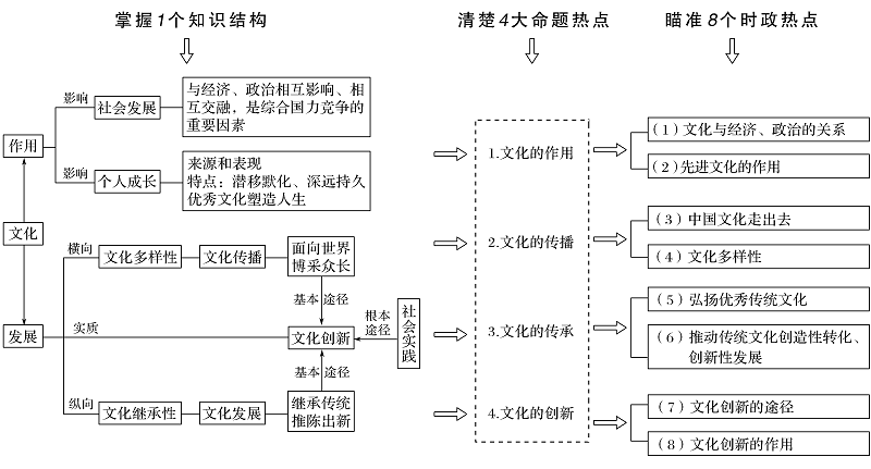 不回避热点、迎着热点考,是高考政治试题的一大特点。考热点,不是考热点材料,而是以热点为背景,通过创设情景,考知识和能力。因此,要关注热点,要了解热点的来龙去脉,把握热点问题的本质,而不能死记硬背热点材料。我们要将理论知识和时政热点进行结合,对热点进行多层次的分析。例如:发挥文化在脱贫攻坚中的重要作用(具体材料略);大力弘扬工匠精神;2019年度国家科学技术奖励大会;发挥科研在阻击“新冠肺炎”疫情中的作用。通过阅读这些材料,可以很好的体会文化的作用。然后通过做相关的试题,在具体的情景中强化对文化作用的理解和运用。