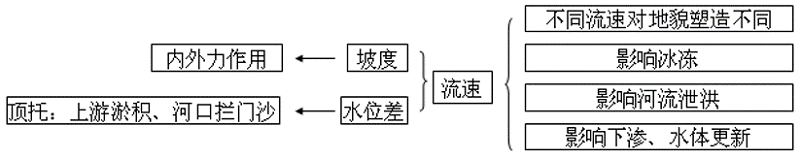 2、微观方向上要推进碎片知识结构化。地理碎片化知识通俗理解就是我们在地理复习和练习中接触的大量与地理相关的零碎信息。这些信息很多是孤立的、突兀的,比如堆积性游荡河道、多级阶地等。这些信息需要我们抽丝剥茧后和教材知识进行衔接。把这种碎片化的知识转化为结构化的知识。这需要我们围绕某一具体知识点展开,融入知识碎片, 实现知识生长,创建思维导图。如以河流水文特征中的流速为例,可构建如下思维导图: