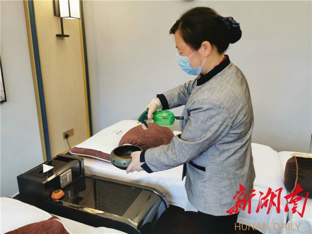 除了专门开发线上预约平台、减少人员聚集外,门店全面卫生消毒,顾客直接接触的物品如毛巾、枕套等,全部“一客一换一清洗一消毒”,增加了升级的健康套餐,并用一次性餐具盛放。
