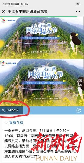 湖南日报·新湖南客户端3月18日讯(记者 徐亚平 通讯员 欧阳武力)乱花渐欲迷人眼 浅草才能没马蹄。今日10时,2020湘赣边区乡村振兴示范区(平江)第二届踏春节暨首届石牛寨网络油菜花节,在平江县石牛寨景区开幕。25万亩油菜花网上迎客。据新湖南客户端、腾讯网统计,共计5473158观众在线“云赏花”。
