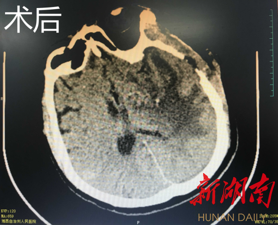 据了解,患者是一名中年男性,突发意识不清2小时入院,头颅CT检查提示:左侧基底节区出血。生死攸关之际,州医院神经外二科主任朱英杰迅速组织术前讨论、分析病情、制定治疗方案。术前在州人民医院副院长黄纯海的指导下,运用3D Slicer软件中导入CT数据并重建血肿模型,依据血肿模型制定术前计划,规划适合患者的手术路径和手术方式,并利用手机APP辅助增强现实定位技术进行精准的手术入路定位。术中神经外二科副主任田志与朱英杰主任紧密协作,利用神经内镜辅助通过小骨窗微创完成脑内血肿清除术,手术切口仅4cm。次日病人复查CT颅内血肿清除干净,无残留及再次出血,病人状态亦明显改善。