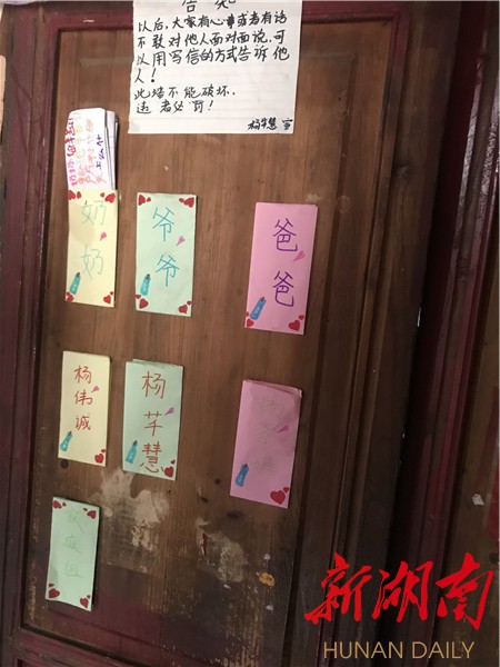 杨芊慧知道父母离婚后,有好长一段时间都不开心。老杨拉着她的手说,“爸爸妈妈不在一起了,但他们都爱你们。”后来一家人再没提及这个话题,他们小心翼翼地守护着这个公开的秘密。杨芊慧在壁板写了一个告知:大家有心事或有话不便当面说,可以写信告诉对方。她还在告知书下贴上标注有每个人名字的纸袋。