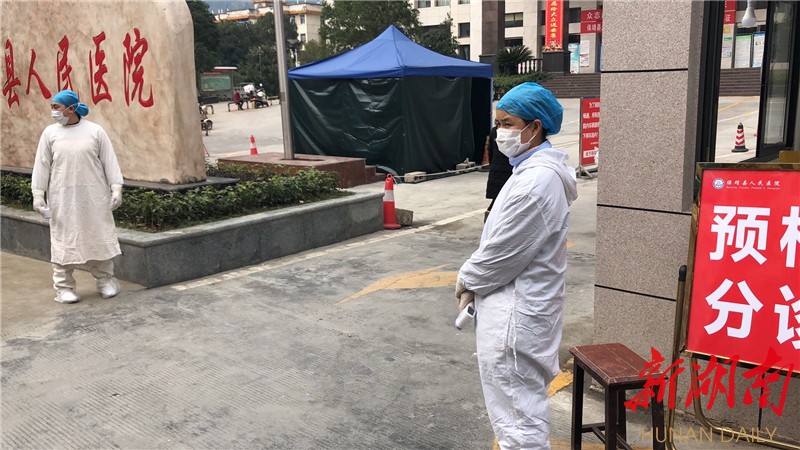 见到她时,她正在医院门口等待县内某复工企业的一名发热工人来医院就诊。这名工人前段时间家里岳父去世,加上家在外地,一回到保靖上班就进行了正常的隔离,不料隔离期间出现了发热症状,企业领导及时联系医院,并把他送到医院,医院根据新冠肺炎最新诊疗方案,经过抽血和影像观察后发现,他的各项关键诊断指标正常,基本上确定他并非新冠肺炎,医院给他开了药,让他回去继续隔离观察。