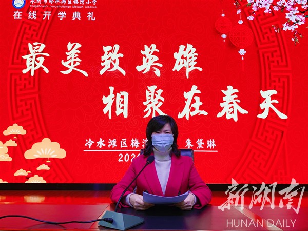 湖南日报·新湖南客户端3月10日讯(通讯员 伍人兵)“这场中国还没有结束、外国才刚开始的疫情,让我们的开学时间一再推迟,我们选择了云相聚、在线学的方式开启我们的新学期。非常时期,迎来特殊的开学。”3月9日,冷水滩区梅湾小学校长朱黛琳以音频的形式通过微信公众号,向全体师生作《最美致英雄 相聚在春天》为主题的线上开学典礼致辞,梅湾小学开启了既特殊又忙碌的新学期。