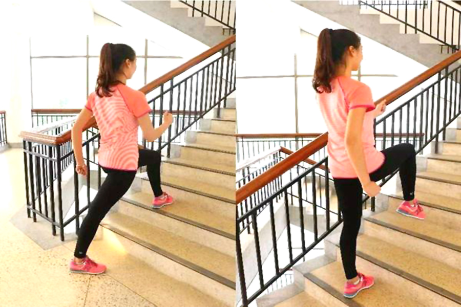 5,半蹲上下。保持屈膝半蹲的状态上下二至四级楼梯,腰背部挺直,保持稳定,注意安全。