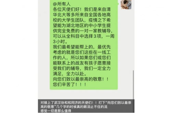 “我们搭建了一张安静的书桌,为湖北地区中小学生家庭提供大学生一对一在线辅导。疫情不止,服务不停。”