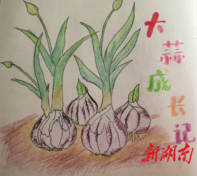 X1806班学生欧阳楚钰发挥所长,用画笔勾勒出大蒜每天的模样,图文并茂地呈现大蒜的生长进程;X1803班学生刘千石分别将大蒜进行水培、土培,每天用尺子精确衡量它们的苗高,比对不同生长环境下的种子生长状况。