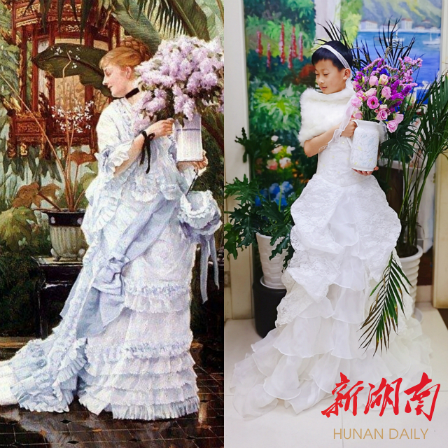 9岁的陈咏礼脑洞大开,他穿上了妈妈的婚纱,头上缠着一条白色的丝带,踩在椅子上让裙摆自然垂下。他侧着脸,用双手托举着花瓶,模仿法国画家雅姆·蒂索的《丁香花束》。