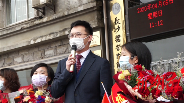在简短而隆重的欢迎仪式上,长沙医学院校长何彬生对第一批凯旋回家的援鄂英雄们表达了热烈的欢迎,对还在武汉奋战的第二批医疗队员表达慰问。并向第一批凯旋回家的10名医疗队员们三鞠躬以示敬意。