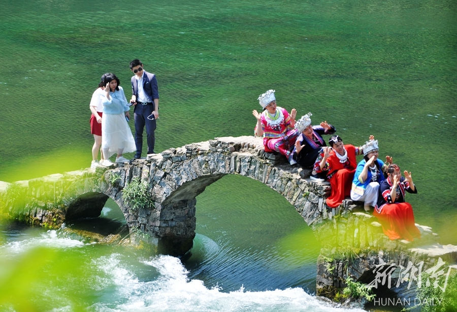 4月29日,凤凰县长潭岗景区“网红桥”,游人赏景游玩、拍照发圈、录拍抖音,不亦乐乎。近日,天气晴好,该景区长潭岗河上的小石拱桥抖音视频经过网络的助推,成为当地人和外地游客的网红打卡地。 滕建康 摄