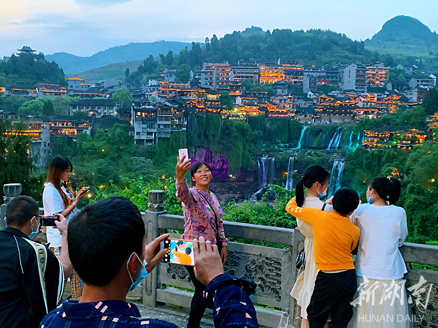 4月29日傍晚,游客在永顺县芙蓉镇欣赏古镇景色。为迎接五一国际劳动节来临,芙蓉镇亮化一新,夜幕降临,四周山坡上的千户土家吊角楼华灯点亮,在绚丽多彩的叠水大瀑布霓虹灯光渲染下,变幻无穷美不胜收。与此同时,游客还可以通过丰富多彩的文艺表演了解当地土家族的民俗风情。 湖南日报记者 徐行 摄