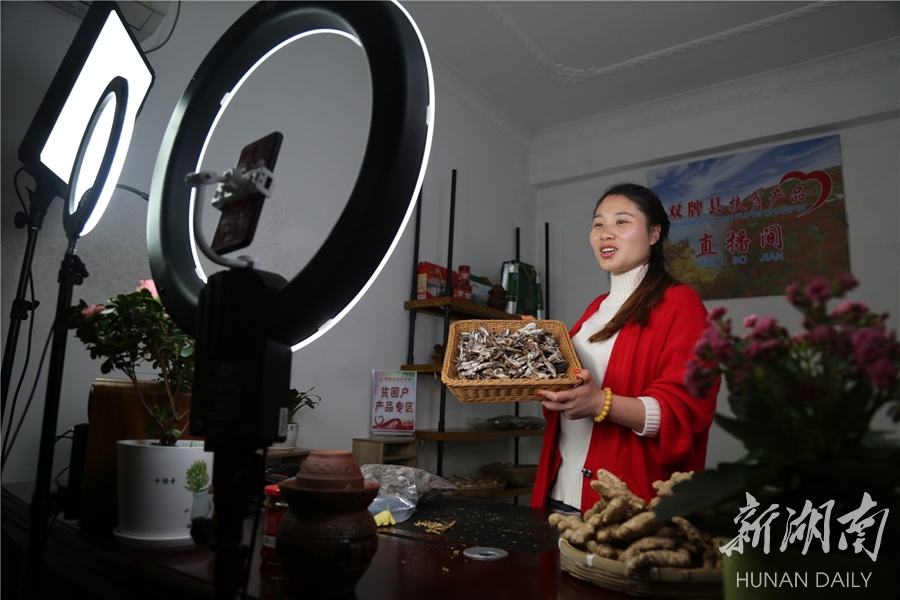 4月22日,工作人员通过网络直播推荐本地土鸡蛋。疫情发生以来,双牌贫困户农产品销路不畅,该县湖南野也味电子商务有限公司利用网上直播平台为贫困户销售当地特色农产品,其中包括双牌高山虎爪姜、干笋子、农家腊肉、土鸡蛋,土鸭蛋等,每天可销售100余单。 潘爱民 摄