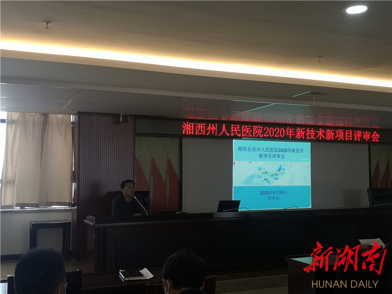 新湖南客户端4月28日讯(通讯员 贾浩 陆山)4月26日下午,湘西土家族苗族自治州人民医院召开“2020年新项目、新技术评审会”,进一步提升医院核心竞争力,促进医疗技术创新和发展,加强专科能力建设。州人民医院副院长向平、黄纯海,医务科负责人、各科室主任及各项目负责人约100余人参加评审会。