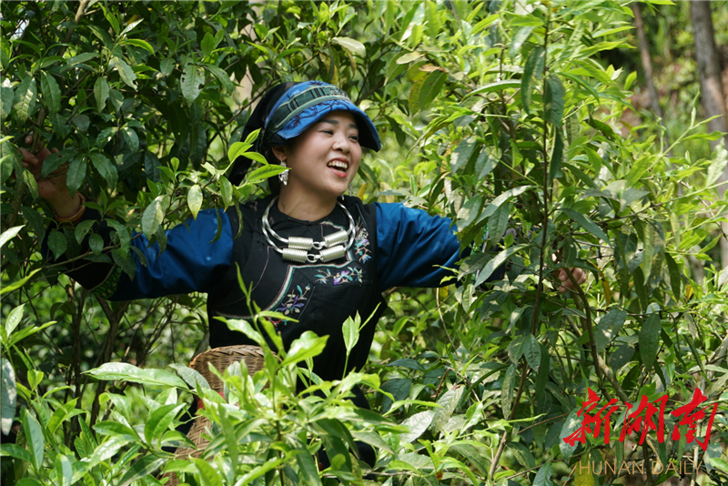 兴到浓头,黄金村苗家阿妹石泽花爬上古茶树,情不自禁唱起了苗歌:“远方的朋友远方的客,请你们来到我们黄金村,喝一杯黄金茶哟!”
