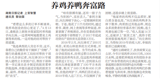 “他家养的鸡鸭不仅品质好,蛋白质含量也高。”向左涛的鸡鸭多为林下散养,肉质胜过其他品种,周边众多消费者经常慕名登门抢购,连土鸡蛋也被订售一空。“收入直逼14万元,还被评上‘脱贫之星’,我终于把贫困狠狠地甩到了脑后。”向左涛坦言,当得知2019年的收入时,幸福的眼泪已溢满双眼。