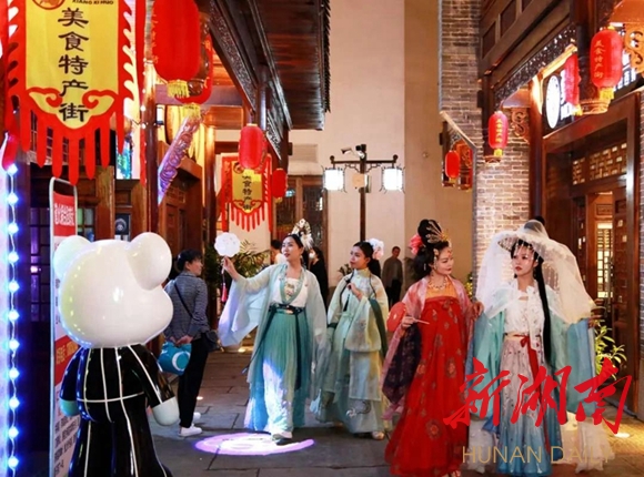 夜幕降临,华灯初上。夜幕下,“烟雨洪江”、新民路传统商业街流光溢彩、霓虹闪烁,时光恍若回转,似乎又见小城故事,“浪漫洪江”帷幕徐徐拉开,各种表演令人目不暇接,让游客充分体验洪江古商城的历史民俗和市井文化。5月2日至4日,“烟雨洪江”每晚都有表演,汉服同袍夜游洪江、古风巡游、汉服群舞、刘员外招婿、京剧表演、非遗木偶戏、清吧小唱等系列夜场节目将轮番上演,抢绣球、唱京剧、看群舞……各类表演带游客感受洪江古商城之夜。