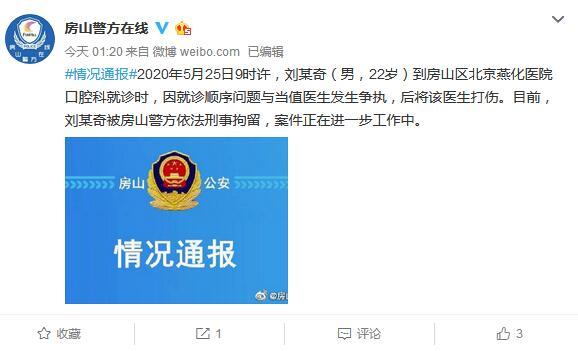 中新网5月27日电 据北京市公安局房山分局官方微博消息,2020年5月25日9时许,刘某奇(男,22岁)到房山区北京燕化医院口腔科就诊时,因就诊顺序问题与当值医生发生争执,后将该医生打伤。