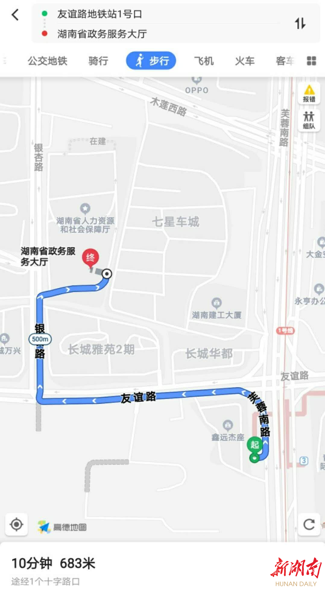 省政务服务大厅位于长沙市天心区银杏路6号,即芙蓉南路与友谊路交叉口西北角。目前前往该大厅办事可乘坐地铁1号线至“友谊路站”,从1号出口出站后,沿友谊路往西走400米,过友谊路沿银杏路往北,再走约200米即到。请看路线图——