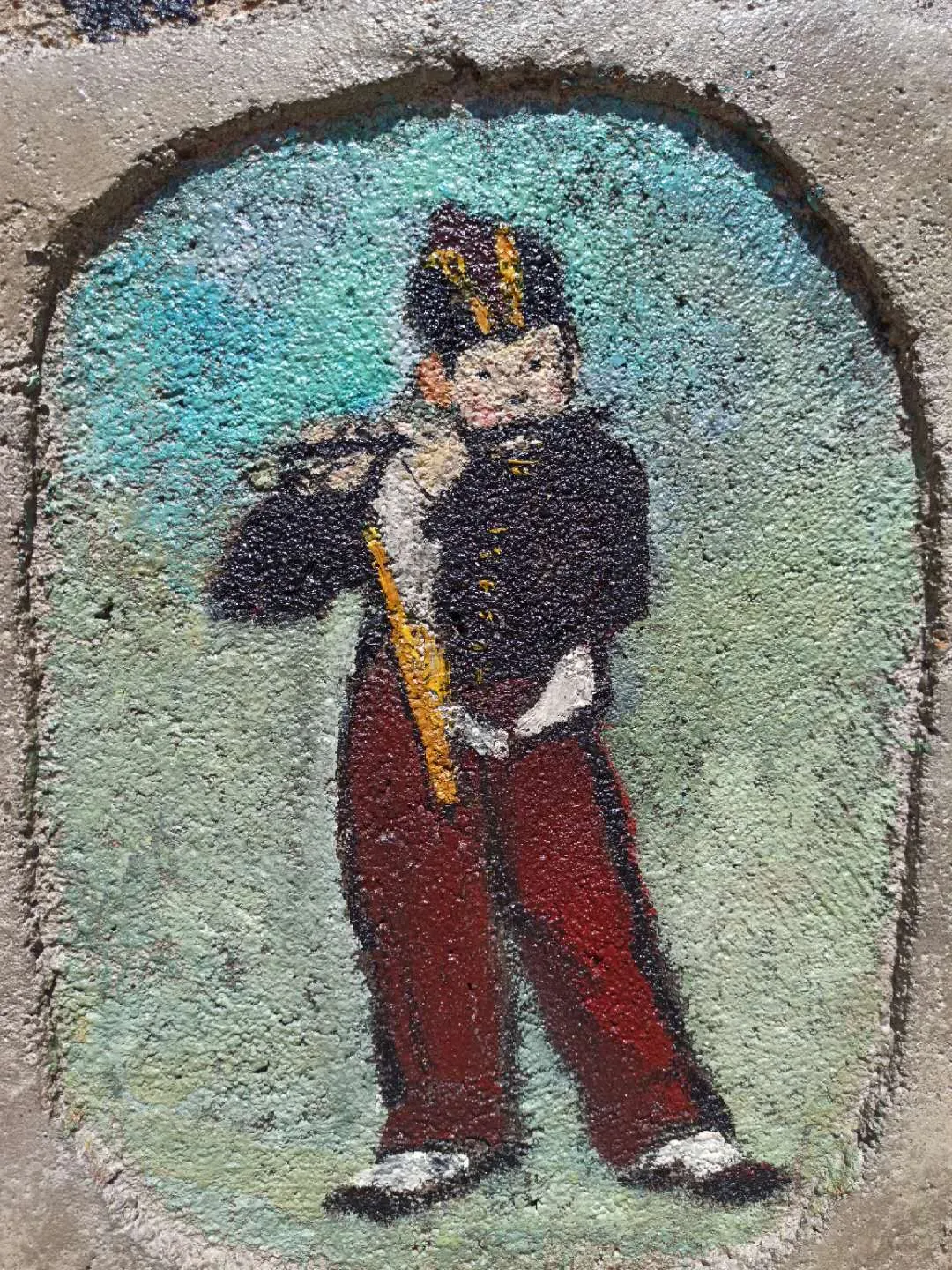 描绘了卫军乐队年轻的士兵正在吹短笛的场景。