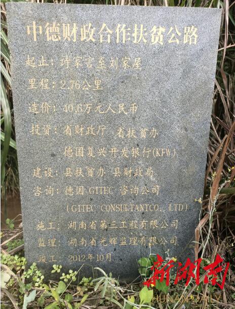 汽车驶出水泥道路,往深山里开去。半山腰上一个急转弯,“中德财政合作扶贫公路”责任碑,被一团团野草野花簇拥着、掩映着。若再过个两三年,就会被绿色所淹没。但淹不掉的是,石洞村这个小山村发展史上永远会有这样一块里程丰碑、中德友谊的见证。这块小小的碑石,看起来尽管有些卑微,但它顶天立地、义薄云天!
