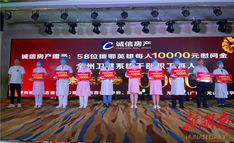 湖南日报·新湖南客户端5月29日讯(记者 向莉君)今天下午,“特别的爱给特别的你”爱心企业慰问湘西土家族苗族自治州援鄂抗疫英雄,推进湘西州卫健系统文明团结创建活动在吉首市举行。湖南诚信鸿基房地产开发有限公司、创维集团、煜龙国际酒店、吉首农村商业银行等5家企业,现场为湘西州58名援鄂抗疫英雄发放慰问物资。