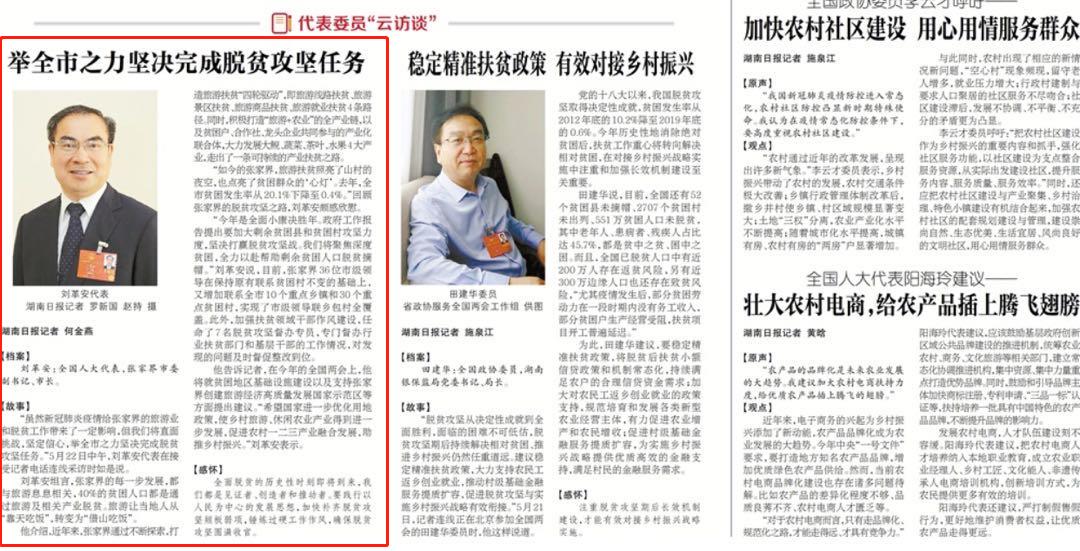 “虽然新冠肺炎疫情给张家界的旅游业和脱贫工作带来了一定影响,但我们将直面挑战,坚定信心,举全市之力坚决完成脱贫攻坚任务。”5月22日中午,刘革安代表在接受记者电话连线采访时如是说。