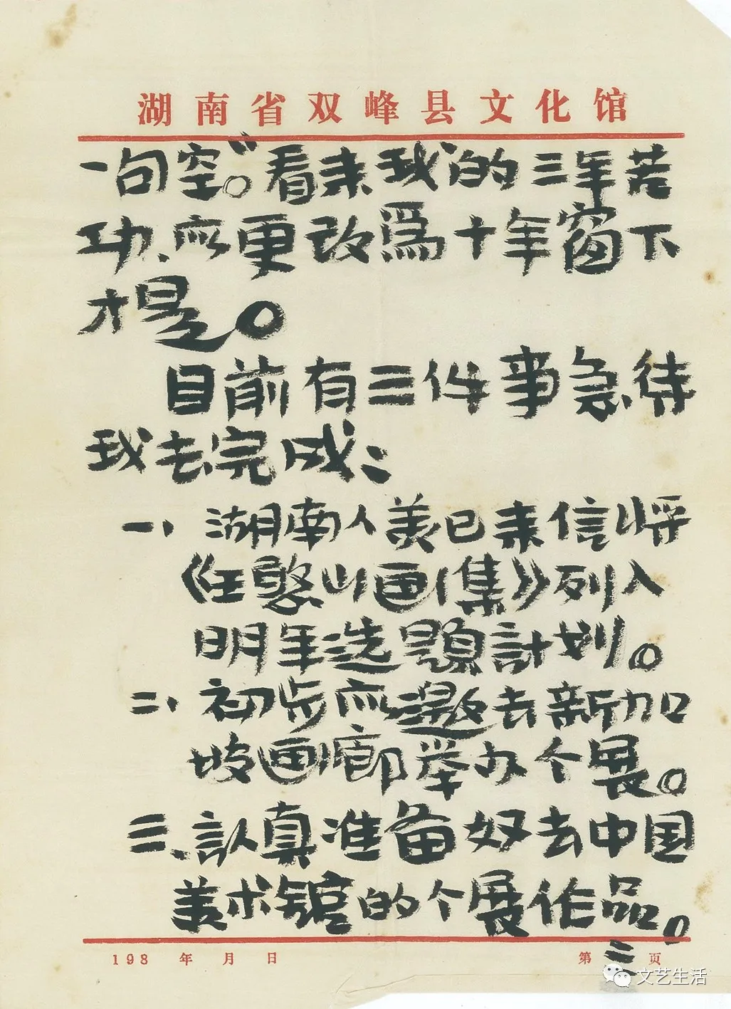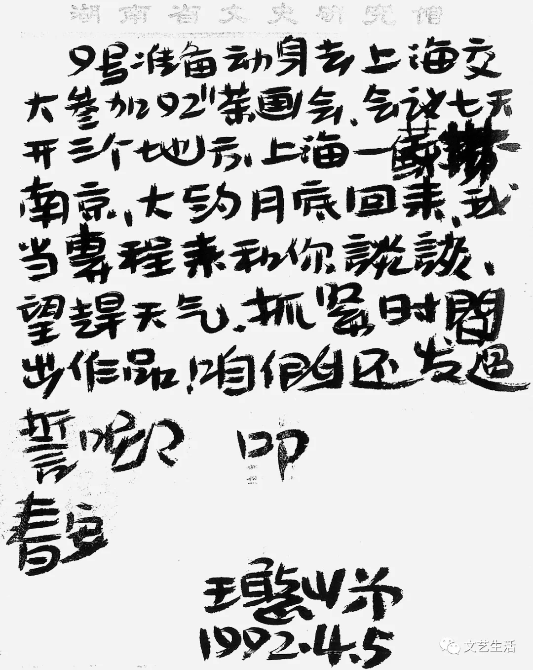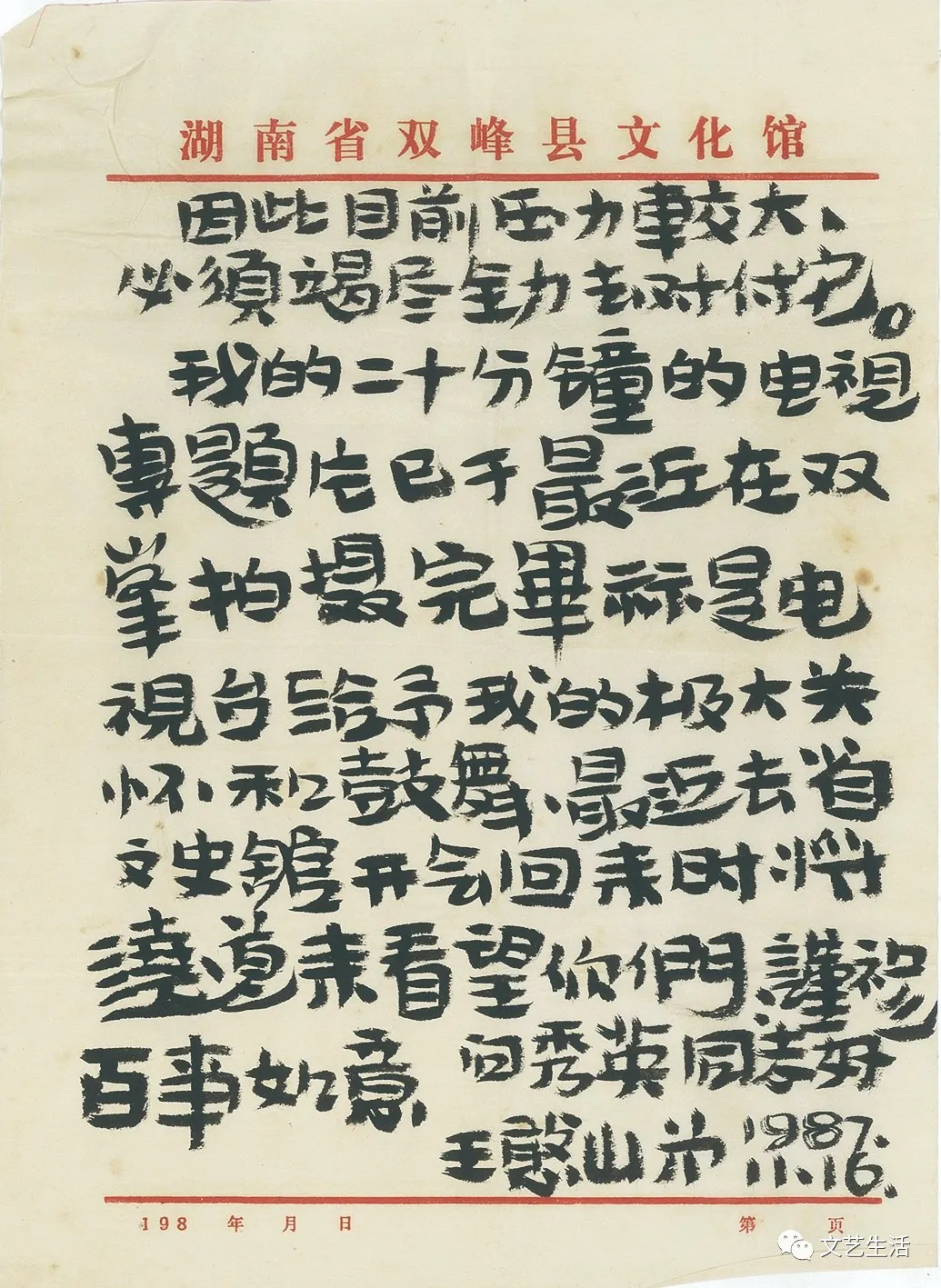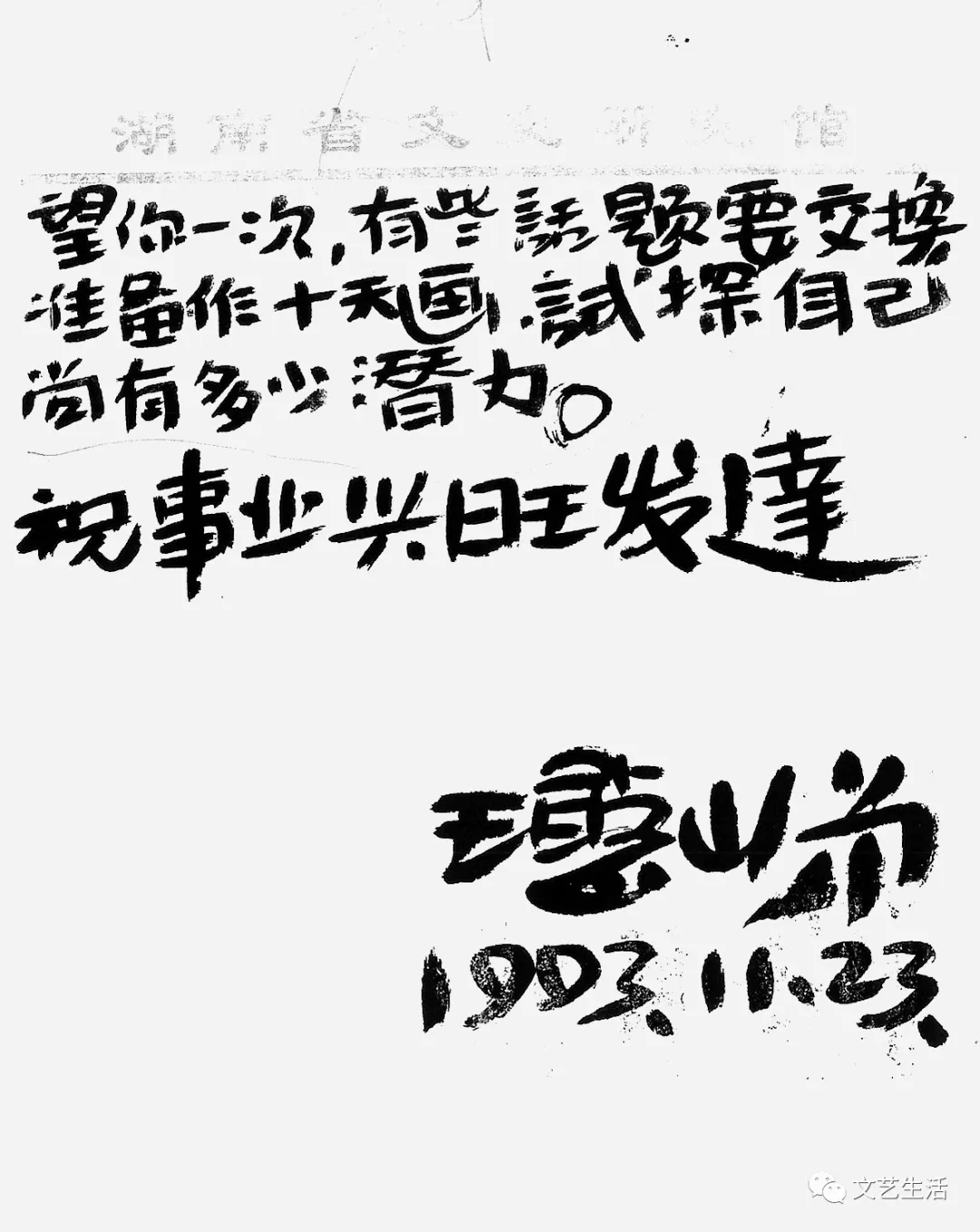 老谢和王憨山颇有交情,知道我也是双峰人,想介绍我和他认识。王憨山本人也非常愿意见我。这时我正在株洲市图书馆主持一个厂矿作者的美术创作班,整天忙不过来,无法抽身去长沙会他。我表示,如果方便的话,欢迎王憨山到株洲来。
