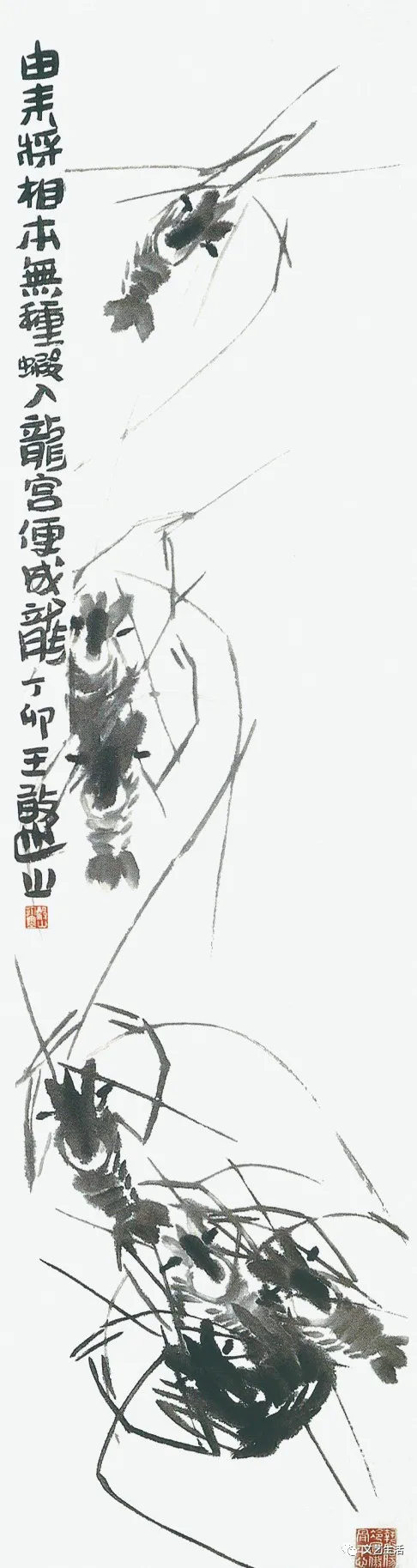 我曾建议他画虾,白石老人画的虾透明感是很强的,如他所说的是池塘小溪的虾,你何不画那江河湖海有着一身硬壳能翻江倒海的龙虾呢?他听了连声叫好,但他一直没有时间付诸实践。至今保留在我记忆中的虾,还是他刚出山时画的那几幅。