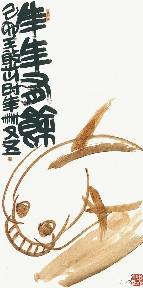 他又从随身带的包里拿出多年前给我看过的小本本,那上面又增添了许多新的构图小稿。我仔细地看后,觉得虽然有一些不错的构思,但总的感觉还是他刚出山时的那批大写意更好。他后来画了很多群鱼图、群雀图,由于画面上东西太多,构图又太满,画里只有“写”的成分,“意”则大为减少,均不如他那些画得简洁的作品耐看。我跟他回忆起许多年前中央美院的几位教授对他画的评价是简比繁好时,他若有所悟地频频点头。