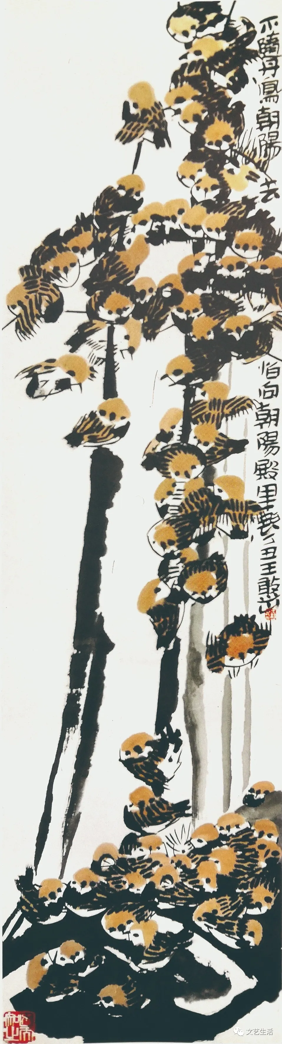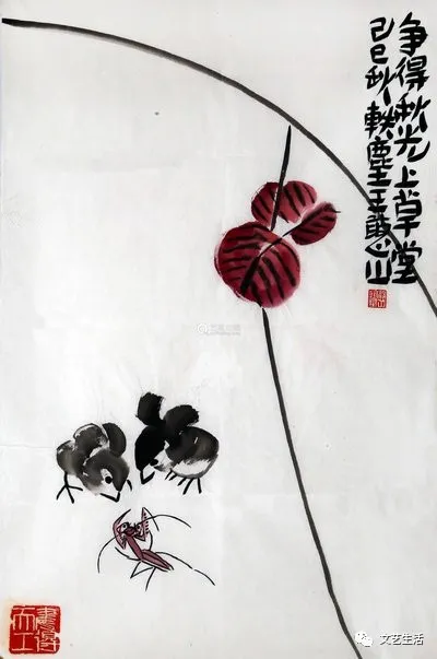 在多次与王憨山谈及他的艺术风格的形成与艺术主张后,我对他的绘画艺术有了更深的了解。王憨山的花鸟画艺术是在继承传统基础上的创新。早年他在学习吴昌硕、齐白石上曾下过一番苦功,他不像有些人画了一辈子画始终跟在别人后面跑,他在学习消化前人优点的同时能够很快融入自己的风格特点,形成属于他个人的绘画语言和手法。