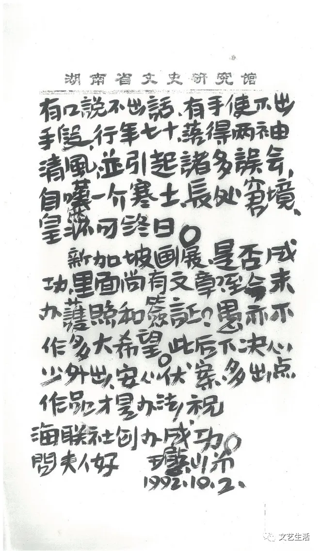 随着王憨山的知名度日益增高,各种社会活动使他很难静下心来读书作画,他多次写信给我,只想收拢猿心,潜心读书作画,但树欲静风不止。有一次,他手拿一份新加坡某某人寄来的邀请函找我,邀请函是特意为他制作的,像一份奖状,五颜六色,印刷得非常精美,他高兴得不得了。他要去新加坡办画展的事也不胫而走,连《湖南日报》都在一篇报道中提到此事。